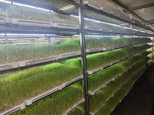 西塔林艾勒银桩生态羊业养殖场——大麦苗草工厂核心示范基地于2023年10月建成并投入使用,总投资达190万元,总占地面积为4200平方米。该基地内的种草棚也被称作“空中牧场”。“空中牧场”充分利用空间,显著提升了牧草产量,有效化解了冬季缺乏鲜草的难题,为牲畜养殖开拓了新途径。与此同时,这种新型育草方式能够更有效地保障牲畜的营养摄入,降低牲畜患病的风险。